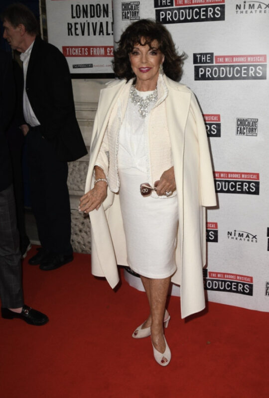 Актерката Џоан Колинс неодамна го посети London’s Garrick театарот, каде што прифати улога во мјузиклот на Мел Брукс „The Producers“. Таа прошета по црвениот тепих во бела облека – од глава до пети – што дополнително ја нагласи нејзината аура на дива.