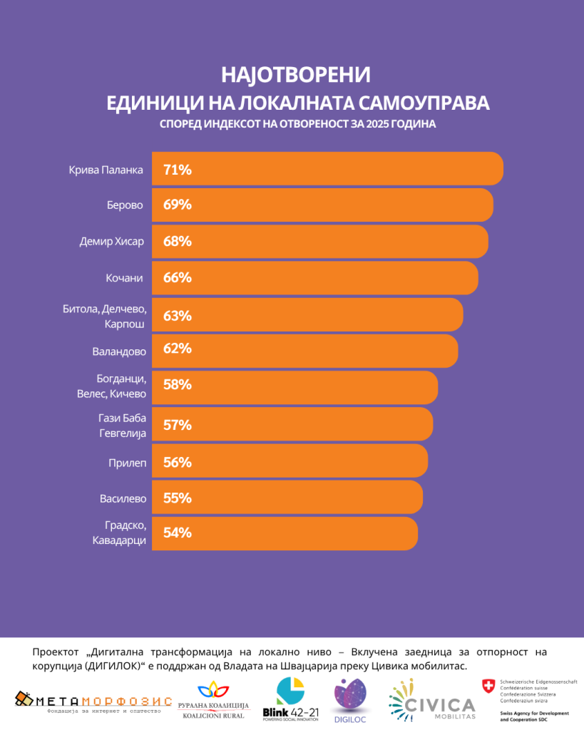 Најотворени општини во 2025 година биле Крива Паланка, Берово и Демир Хисар, додека како најзатворени за своите граѓани се оценети Демир Капија, Сопиште, Лозово и Студеничани, покажуваат наодите од Индексот на отвореност за 2025 година, што беше промовиран денеска на тематскиот форум „Отворена општина – активна заедница“. Истражувањето, кое ги опфати сите 80 општини и Градот Скопје и покажува дека меѓу општините со поголема отвореност влегуваат и Кочани, Битола, Делчево, Карпош, Валандово, Богданци, Велес, Кичево, Гази Баба и Гевгелија, Прилеп и Василево, а меѓу најзатворените се и Кривогаштани, Чучер Сандево, Врапчиште, Росоман и Шуто Оризари.