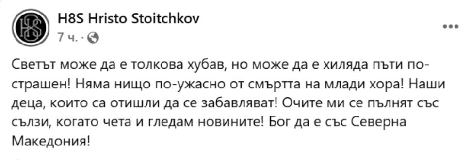 „Светот може да биде толку убав, но може да биде и илјада пати пострашен! Нема ништо поужасно од смртта на млади луѓе! Наши деца кои отишле да се забавуваат! Очите ми се полнат со солзи кога читам и гледам вести! Господ нека е со Северна Македонија!“, напиша на Фејсбук легендата на бугарскиот и на светскиот фудбал.