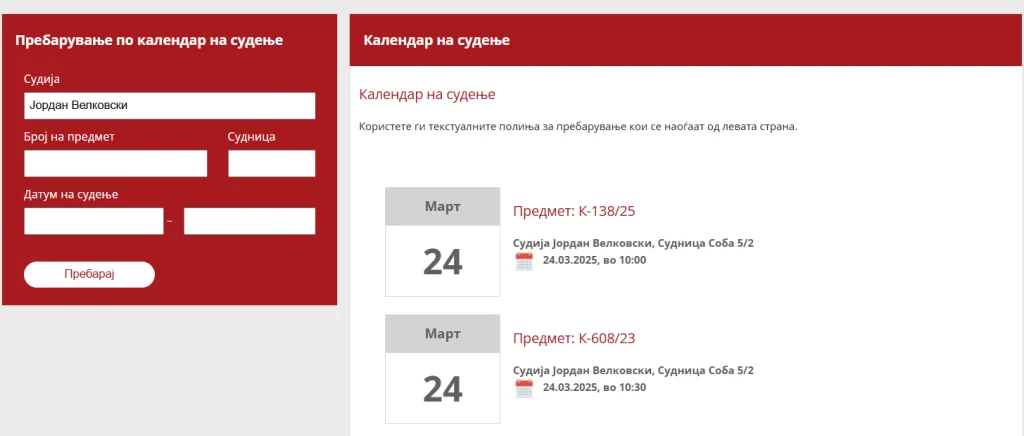 Ја проверивме веб-страната на судот и забележавме дека од рочиштата што ќе ги одржи судијата Велковски е повлечено само рочиштето за модуларната.