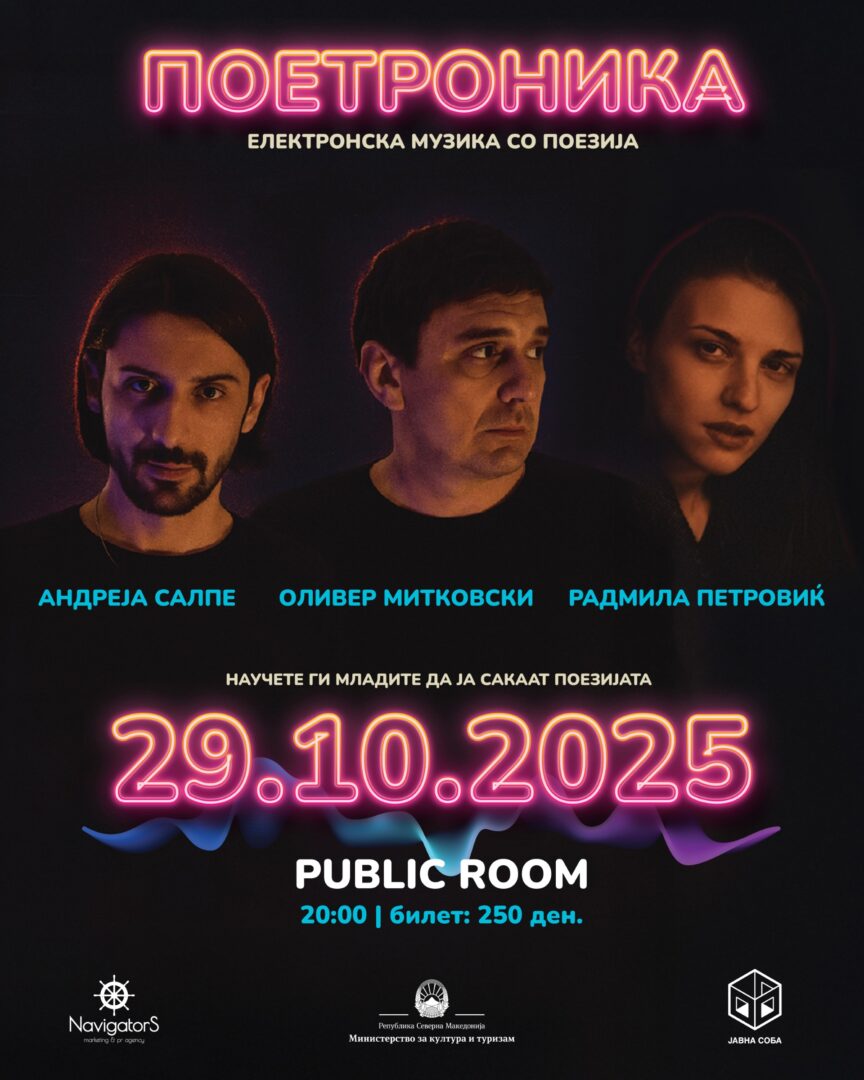 Вечерва во 20:00 часот во Public Room, Скопје ќе се одржи „Поетроника за млади“, уникатен музичко-поетски перформанс што ја претвора поезијата во живо, звучно и современо искуство.