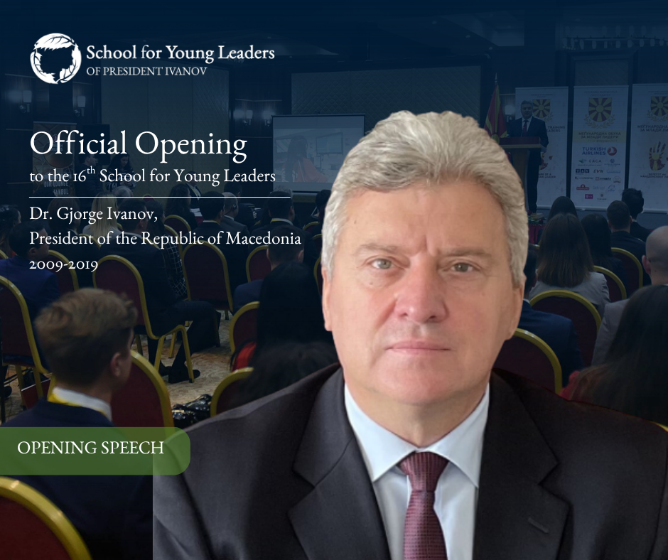 Претседателот Иванов, поздравувајќи ја новата генерација учесници на Школата за млади лидери, се осврна на главната тема на 16-та Школа и на целите за одржлив развој на Обединетите нации и Агендата 2030, единствената глобална рамка што нуди излез од кризите и предизвиците со кои се соочува човештвото, зад која застанаа сите земји членки на ОН. Во своето обраќање тој посочи дека постојат бројни причини поради кои овие цели сѐ уште не се целосно остварени, но дека младите располагаат со највредните ресурси како надежта, енергијата, креативноста и можностите, за да придонесат кон нивно решавање. Во таа насока, тој истакна дека вештачката интелигенција мора да се користи како алатка за креативни решенија на предизвиците во сите области, потенцирајќи дека во ова време се бара нова дефиниција на лидерството – лидер кој ќе може да одговори на комплексноста на современиот свет. Иванов нагласи дека лидерот на иднината треба да биде способен да одговори на она на што не може да одговори вештачката интелигенција и тоа со својата емоционална интелигенција, интуиција, етичност, креативност и човечност, карактеристики кои го прават човекот незаменлив. Тој посочи дека лидерите на иднината не треба да се натпреваруваат со вештачката интелигенција, туку да создаваат синергија со неа. Наместо стравот, младите треба да посегнат кон надежта и да развиваат одговорен пристап кон новите технологии, користејќи ги нивните придобивки и поставувајќи етички механизми кои ќе спречат нивна злоупотреба.