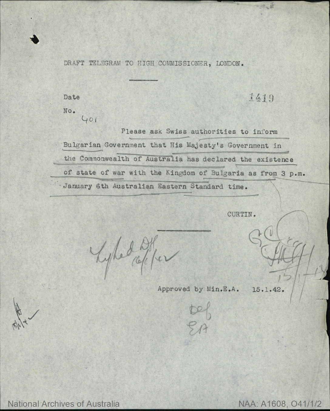 Потврдено на 16.1.42“, се наведува во телеграмата со објава на војна на Кралството Бугарија од страна на гувернерот (премиерот) на Австралија на 16 јануари 1942 година.