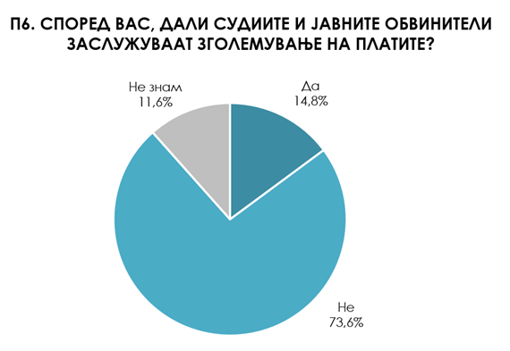 На прашањето дали судиите и јавните обвинители заслужуваат зголемување на платите, дури 73,6 отсто од испитаниците одговориле негативно. Само 14,8 отсто од испитаниците сметаат дека зголемувањето на буџетот за македонското правосудство е заслужено.