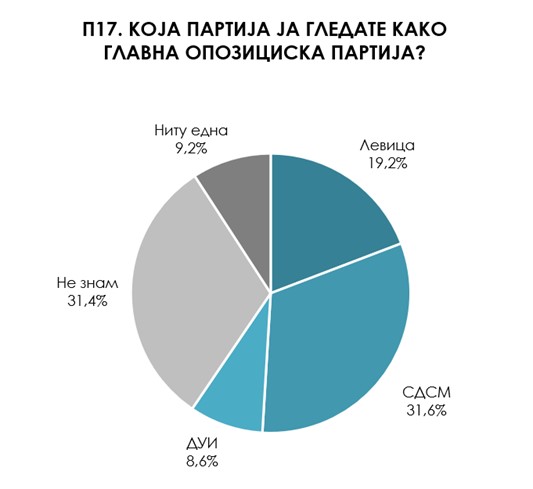 Според најголем дел од испитаниците главна опозициска партија во Македонија е СДСМ (31,6%), додека за 19,2% од испитаниците главна опозициска партија е Левица, а за 8,6% е ДУИ.