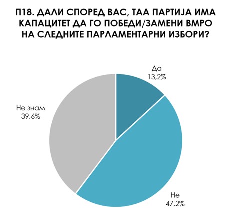 13,2% од испитаниците се согласуваат дека партијата која според нив е главна опозициска партија има капацитет да го победи/замени ВМРО-ДПМНЕ на следните парламентарни избори.
