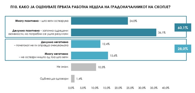 Повеќе од 60 отсто од испитаниците со место на живеење во Скопскиот регион позитивно ја оценија работата на новиот градоначалник на Скопје Орце Ѓорѓиевски во неговата прва работна недела (60,1%). Негативна оценка дале 28 отсто од испитаниците.