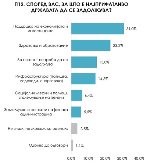 Според испитаниците најприфатливо е задолжување на државата со цел поддршка на економијата (31%) и инвестициите како и за подобрување на состојбите во здравството и во образованието (23,2%).