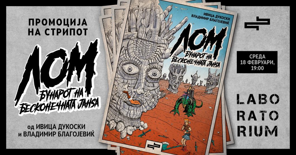 Во просториите на „Лабораториум“ на 18 февруари (среда), со почеток во 19 часот, ќе се одржи промоција на стрипот „Лом: Бунарот на бесконечната јанѕа“ од авторите Ивица Дукоски и Владимир Благојевиќ, во издание на Фликер Студио.