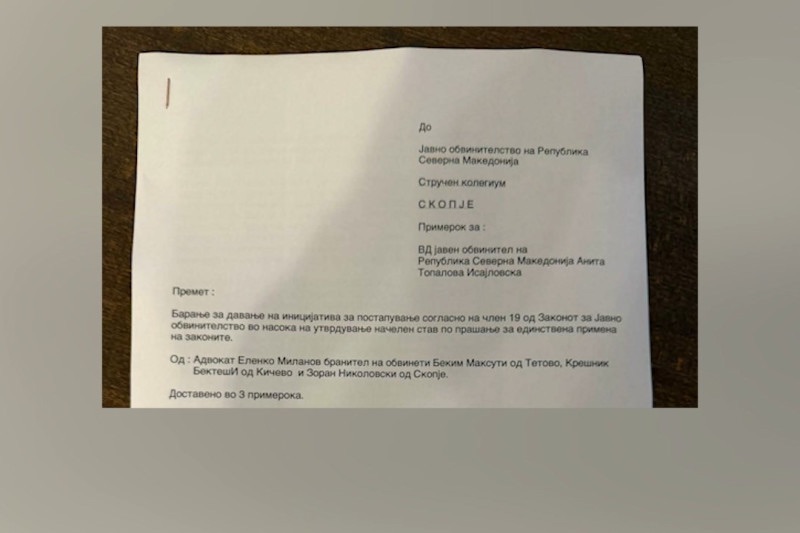 – Ова барање- иницијатива се доставува за постапување на стручниот колегиум , согласно на член 19 од законот на ЈО за единствена примена на законите со што ќе се ревидира поднесениот обвинителен акт од 13.20205 но и повлекување на обвинението во однос на обвинети лица кои немале директни дејствија или овластување во време на настанатиот пожар како тоа неспорно се чини со поднесениот обвинителен акт од ОЈО ГОКК за кривично дело „ тешки дела против безбедноста“ во однос на лица со директни овастувања при настанувањето на самиот пожар како службени или одговорни лица.