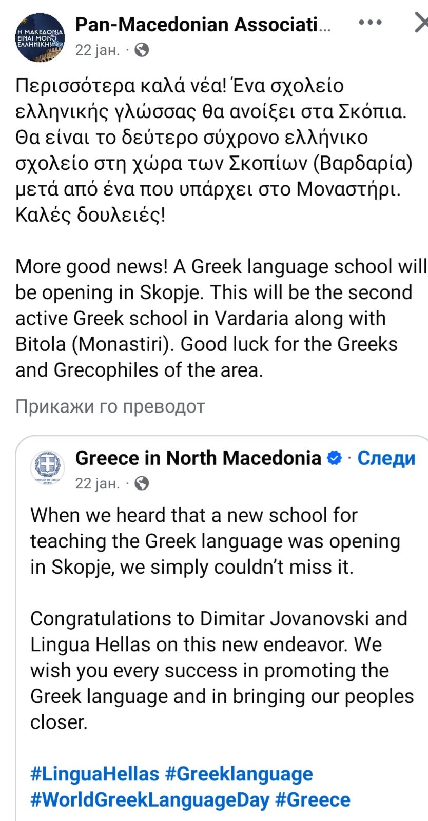 Честитките се од Панмакедонската ацоцијација (најверојатно од Грција), која за Македонија не го користи дури ни името наметнато со Преспанскиот договор, туку земјава ја нарекува „Вардарија“ или „Скопион“, како и од профилот на „Грците во Северна Македонија“. Честитките за новото училиште за грчки јазик од профилот на Грците во Македонија, сепак се покоректни, посакувајќи му успех на сопственикот во „промоцијата на грчкиот јазик и зближувањето на нашите народи“.