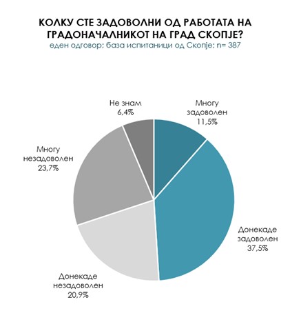 На прашањето колку сте задоволни од работата на градоначалникот на Скопје, половина од испитаниците (49%) одговорија позитивно, а 44,6 отсто се незадоволни.