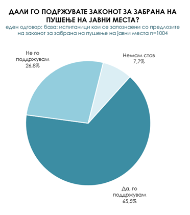 Голема е и поддршката од граѓаните за забрана за пушење на јавни места (65,5 %), а 26,8 не ја подржуваат оваа планирана мерка.