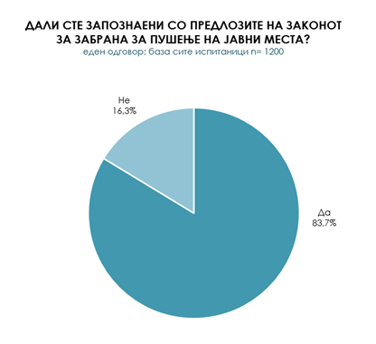 Мнозинството од испитаниците (83,7%) изјавиле дека се запознаени со предлозите на законот за забрана на пушење на јавни места. Од нив 65,5% го поддржуваат овој закон, додека 26,8% не го поддржуваат.