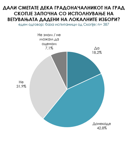 Речиси две третини од испитаниците одговорија дека градоначалникот на Град Скопје почна со исполнувањето на ветувањата дадени на локалните избори.
