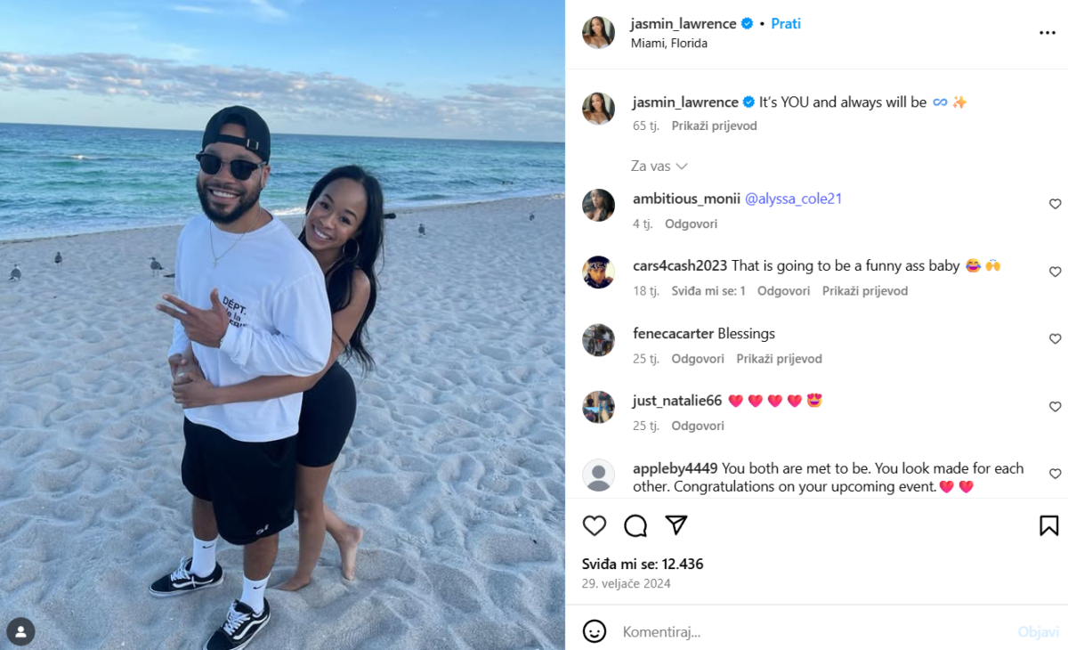 Двојката се вери во ноември 2024 година. Ерик, 35, клекна на едно колено пред Јасмин, 29, во соба украсена со свеќи, бели рози и огромно црвено срце.