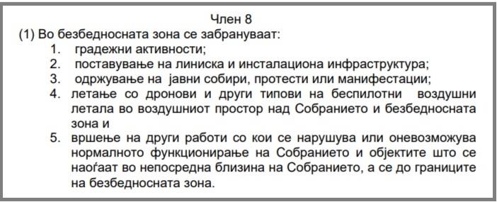 „Безбедносната зона е површината на просторот околу објектот на Собранието со дефинирана граница којашто ги опфаќа земјиштето и воздушниот простор, до која од безбедносни причини и заради безбедносни интереси на државата пристапот и користењето се ограничени со закон“, пишува во членот 3.