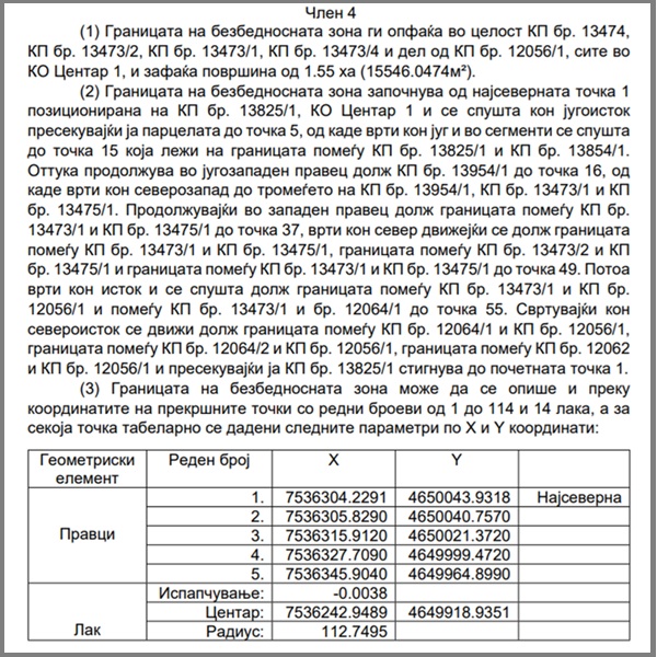 Во член 4 се наведени границите и детално е опишано што содржи просторот околу Собранието којшто влегува во безбедносната зона (катастарски парцели, површина, координати на прекршните точки).