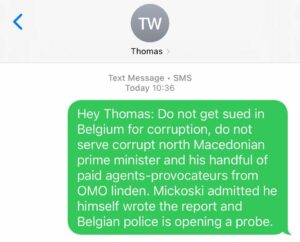Во една од пораките, бугарските ботови на англиски му пишуваат на Томас Вајц за „да не го судат за корупција во Белгија, да им служи на корумприраниот северномакедонски премиер Мицкоски и неговите платени агенти-провокатори од ОМО Илинден“. Според заканувачот, наводно Мицкоски признал дека сам го пишувал извештајот и дека белгиската полиција отворила истрага.