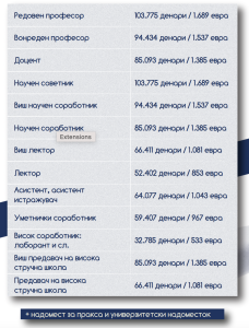 Ректорката на УКИМ – Скопје добива вкупно 203.775 денари месечно, од кои 100.000 денари се функционален додаток. Ректорот на битолскиот универзитет има уште повисока нето-плата од 244.834 денари, при што 141.059 денари се надомест за функцијата. Во просек, платите на ректорите се движат од 136.000 до 245.000 денари, без да се вклучат додатоците за минат труд, менторства или други надоместоци.