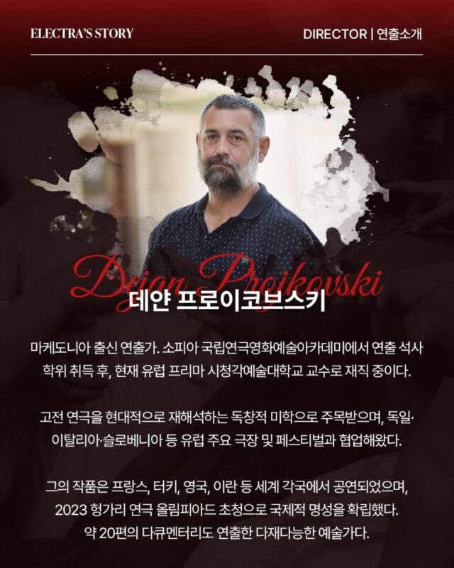 На 26 јули во Инчеон, Јужна Кореа, се случи премиерата на театарската претстава „Приказната на Електра“ од Сашо Димоски, во режија на Дејан Пројковски. Претставата беше дел од програмата на Националниот театарски фестивал и привлече големо внимание на корејската културна јавност.