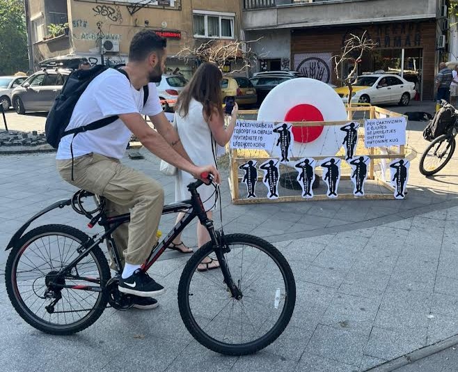 Оваа активистичка инсталација, која е поставена на крстосницата на улиците Ленинова (Аминта трети) и булеварот Партизански одреди, во порта Буњаковец, потсетува дека културата и уметноста се моќни алатки за промена и заштита на демократските вредности.